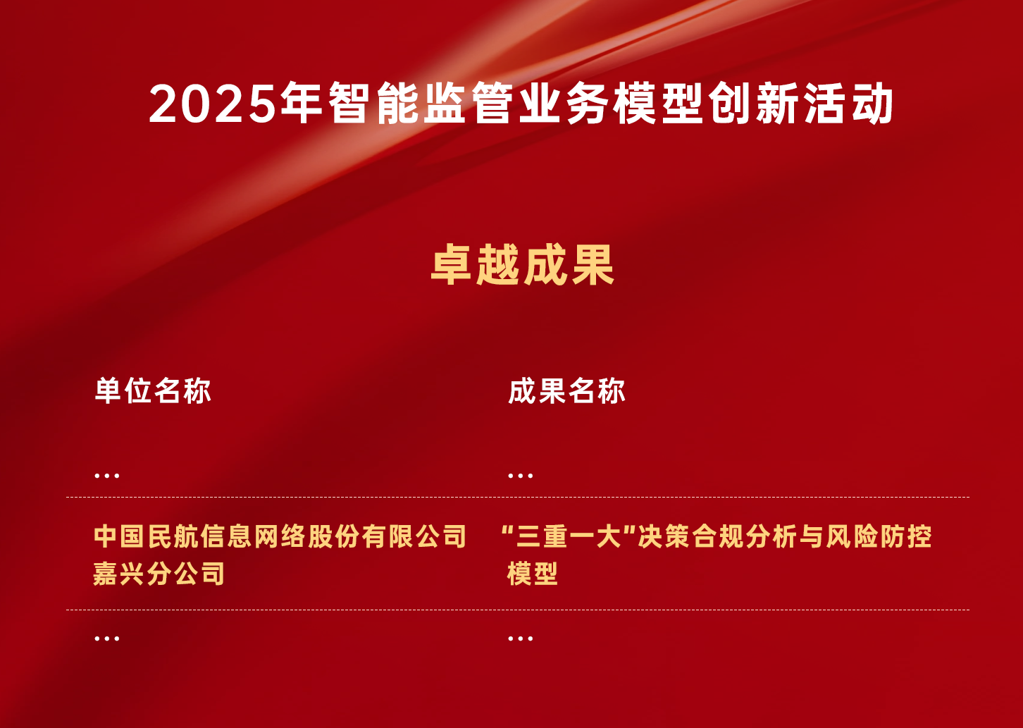 【办公室 华东研发中心(嘉兴分公司) 联合报道】近日,2025年智能监管业务模型创新活动优秀成果正式揭晓。本次活动由国务院国资委办公厅主办,以“数据建模 赋智监管”为主题,旨在发挥数据要素价值,挖掘优秀智能监管模型,推动国资国企数字化智能化水平整体提升。 由中国航信报送的“三重一大”决策合规分析与风险防控模型荣获该活动最高荣誉-卓越成果奖。